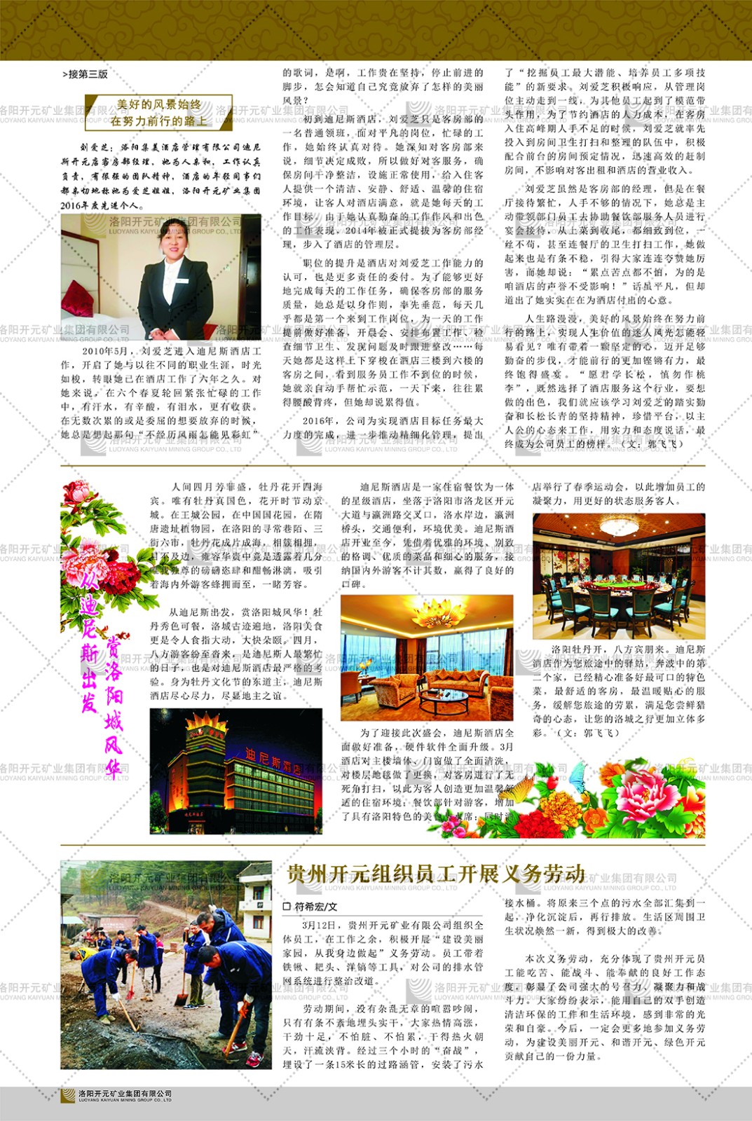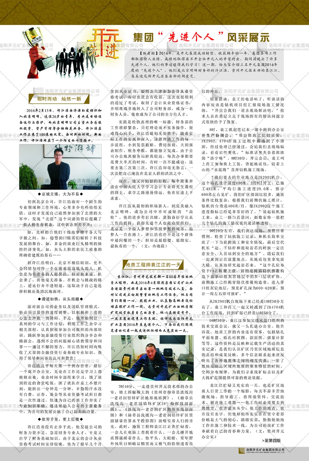 洛陽開元礦業(yè)集團(tuán)有限公司簡介洛陽開元礦業(yè)集團(tuán)有限公司,始成立于2006年,位于洛陽市開元大道269號。集團(tuán)旗下共有十余家全資子公司,業(yè)務(wù)涉及有色金屬礦山開發(fā)、礦產(chǎn)品購銷與進(jìn)出口貿(mào)易、房地產(chǎn)開發(fā)、文化藝術(shù)、企業(yè)管理與咨詢、資本投資等多個領(lǐng)域。2024年,集團(tuán)公司銷售總額達(dá)7.8億元。民建河南省委委員、民建河南省委企業(yè)委副主任、民建洛陽市委委員、企業(yè)委主任、洛陽民建企業(yè)家協(xié)會會長許明月是公司創(chuàng)始人,現(xiàn)任洛陽開元礦業(yè)集團(tuán)有限公司董事長。在礦業(yè)領(lǐng)域,洛陽開元礦業(yè)集團(tuán)擁有多家實(shí)力雄厚的子公司:貴州開元礦業(yè)有限公司探、采礦權(quán)面積共11.33平方公里;興??h銅鑫礦業(yè)有限公司探礦權(quán)面積8.76平方公里,礦山資源潛力巨大;2021年,開元集團(tuán)與盧氏中科礦業(yè)有限公司開展戰(zhàn)略合作。盧氏中科礦業(yè)有限公司專注于有色金屬的浮選、加工和銷售,擁有強(qiáng)大的技術(shù)支撐平臺,是集探、采、選、冶、研為一體的中大型綜合礦業(yè)企業(yè)。目前,盧氏中科王家河1000噸選礦廠已成功投產(chǎn),雙河金礦、柳關(guān)欒盧鉛鋅礦相繼順利開工,樓房銀礦與圪老灣鉛鋅礦的深部探礦重大突破,標(biāo)志著礦山版圖取得重大進(jìn)展,為開元集團(tuán)后續(xù)發(fā)展奠定了堅(jiān)實(shí)基礎(chǔ)。在文化傳媒領(lǐng)域,洛陽市明月美術(shù)館通過豐富多樣的藝術(shù)展覽、學(xué)術(shù)研討和公共教育活動,努力打造一個集展覽、交流、教育、研究為一體的綜合性藝術(shù)平臺。此外,在金融投資領(lǐng)域,開元集團(tuán)旗下的北京明峰資本管理有限公司專注于投資具有高增長潛力的優(yōu)秀企業(yè),特別是高科技、新能源、環(huán)保等新興產(chǎn)業(yè),為客戶提供個性化的資產(chǎn)配置服務(wù)。在做好企業(yè)經(jīng)營的同時,開元集團(tuán)始終不忘企業(yè)的社會責(zé)任和家國情懷,以突出的愛心公益事跡,開展了一系列公益慈善活動:“民建林”公益事業(yè)通過“思源基金”“幫幫公益”線上公益平臺,與眾多愛心人士籌措資金20余萬元;資助541名貧困大學(xué)生共計(jì)270余萬元,推進(jìn)“數(shù)字助力——河南AI人才培養(yǎng)”;捐款10萬元,馳援京津冀、黑龍江洪水地質(zhì)災(zāi)害……公司于2017年底被洛陽市慈善總會評為“洛陽慈善風(fēng)云榜——十大愛心集體”。洛陽開元礦業(yè)集團(tuán)有限公司秉承持續(xù)發(fā)展理念,憑借多年來良好的企業(yè)信譽(yù)與經(jīng)營業(yè)績,與全國多家企業(yè)建立了良好合作關(guān)系,受到社會各界的一致好評,多次榮獲“納稅標(biāo)兵”“先進(jìn)企業(yè)”“招商引資模范企業(yè)”等榮譽(yù)稱號。回望來時路,開元人勠力同心,以“闖”的精神和“創(chuàng)”的勁頭,一路披荊斬棘,踏過千山萬水;展望新未來,開元人凝心聚力,不執(zhí)于“舊”,無畏于“新”,秉承“勇于跨越,追求卓越”的企業(yè)精神,乘著國家高質(zhì)量發(fā)展新征程的東風(fēng),跨過高山,越過大海,向著集團(tuán)多元化、國際化的目標(biāo),逐夢遠(yuǎn)航,跨越前行!